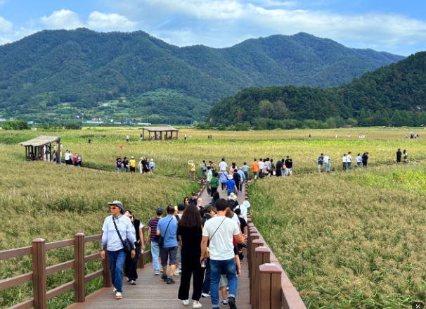 ![]() 추석 연휴 순천만습지를 찾은 방문객들이 가을 정취 속에서 갈대밭 산책을 즐기고 있다 |