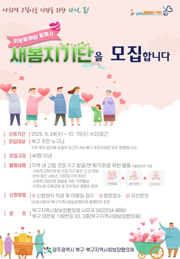 ‘새봄지기단’은 북구 주민 누구나 참여할 수 있으며 관심 있는 주민은 북구 지역사회보장협의체 누리집을 참고해 신청서를 이메일 또는 방문 접수하면 된다.