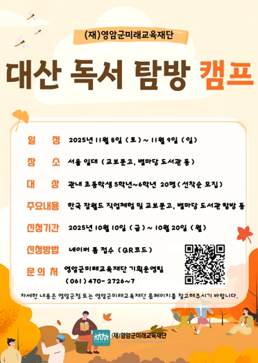 ![]() 영암군미래교육재단, 대산 독서 탐방 캠프 참가자 모집 |