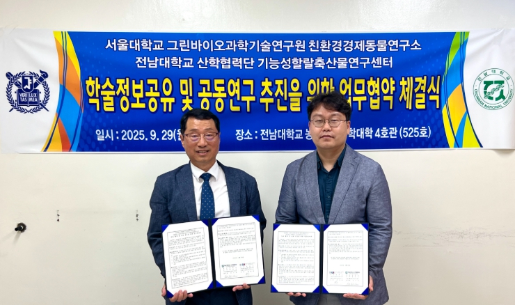 전남대 산학협력단 기능성할랄축산물연구센터는 지난 9월 29일 서울대학교 그린바이오과학기술연구원 친환경경제동물연구소와 학술정보 공유 및 공동연구 추진을 위한 업무협약(MOU)을 체결했다.