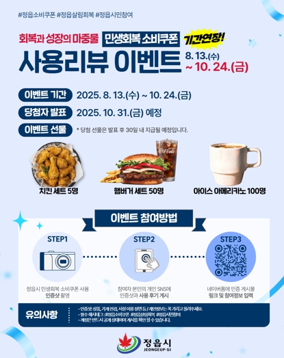 ![]() 정읍시, 민생회복 소비쿠폰 이벤트 24일까지 연장…“참여하고 선물 받으세요” |