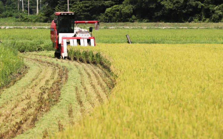 ![]() 볏짚을 갈아넣기 위해 볏짚을 잘라내며 벼를 수확하고 있다. |