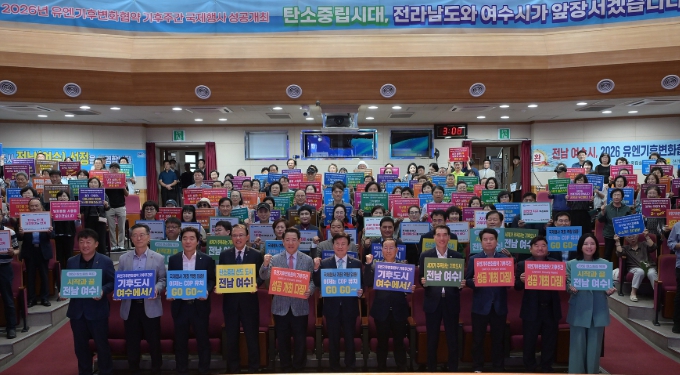 ![]() 4일 진남문예회관에서 ‘2026년 유엔기후변화협약(UNFCCC) 기후주간(Climate Week)’ 국내 개최 후보지 선정을 기념하는 행사를 열고 유치를 위한 의지를 다졌다. |