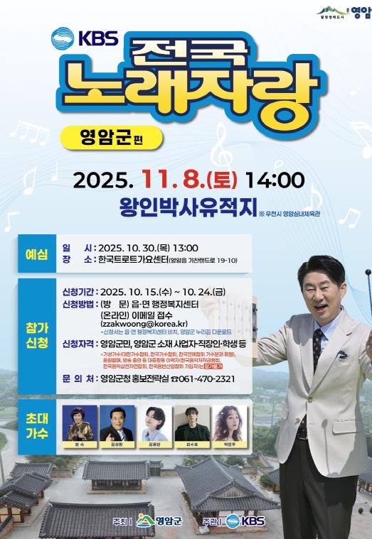 영암군 주최, KBS 주관으로 11/8일 오후 2시 왕인박사유적지에서 열리는 전국노래자랑에서 솜씨를 뽐낼 영암군민 등의 신청을 받는다.