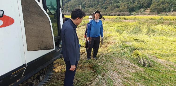 ![]() 지난 13일 오명종 성전면장이 벼 수확 현장을 방문해 농민의 의견을 청취하고 있다. |