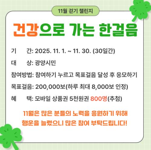 ![]() 광양시, 워크온 ‘건강으로 가는 한걸음 11월 걷기 챌린지’ 운영 |