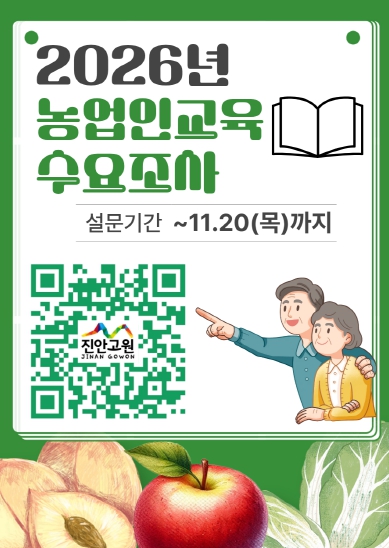 ![]() 진안군, 농업인 교육 수요조사 11월 20일까지 실시(2026 교육수요조사 포스터) |