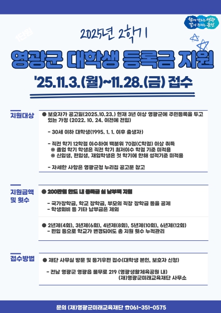 신청은 2025년 11월 3일부터 11월 28일 18:00까지이며, 접수처는 영광군미래교육재단 사무실로 방문 또는 우편 접수가 가능하다.