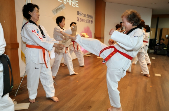 ![]() 23일 첨단종합사회복지관에서 열린 문화예술제에서 태권도 회원들이 역량을 뽐내고 있다. |