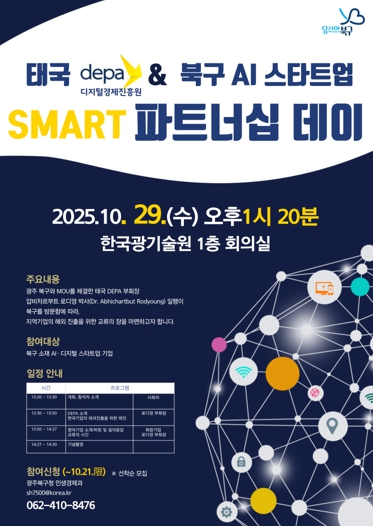 26일 북구에 따르면 오는 29일 한국광기술원에서 태국 디지털경제진흥원과 함께 ‘SMART 파트너십 데이’ 행사를 개최한다.