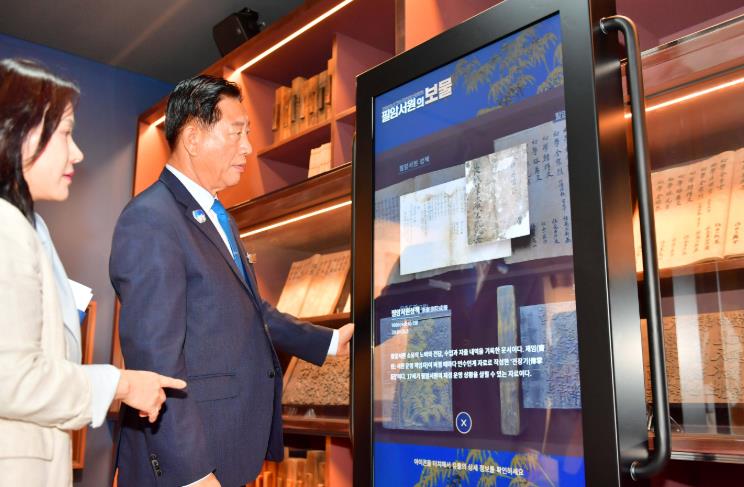![]() 김한종 장성군수가 디지털 전시 공간으로 거듭난 필암서원 유물전시관에서 역사 정보를 확인하고 있다. 장성군 제공 |