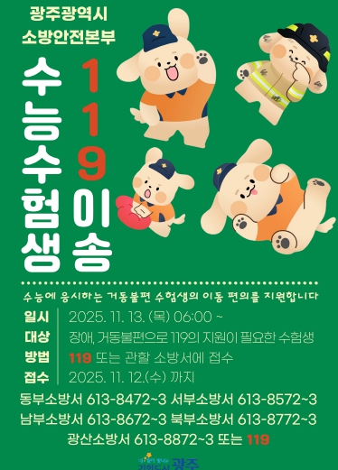 김희철 광주소방안전본부 119대응과장은 “수험생 모두가 안전하고 편안하게 시험을 치를 수 있도록 시험장 안팎에서 최선을 다하겠다”며 “몸이 불편한 수험생들이 좋은 결실을 얻는데 119 이송지원 서비스가 보탬이 됐으면 한다”고 말했다.