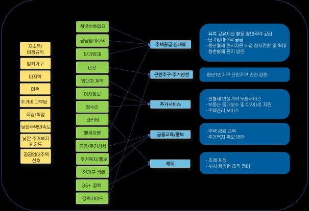연구원은 이러한 분석들을 토대로 △유휴 공유재산을 활용한 청년주택 공급 △단기 임대주택 공급 △동네 안전 강화 △주거 서비스 지원 확대 등 총 11가지의 정책과제를 제안했다.