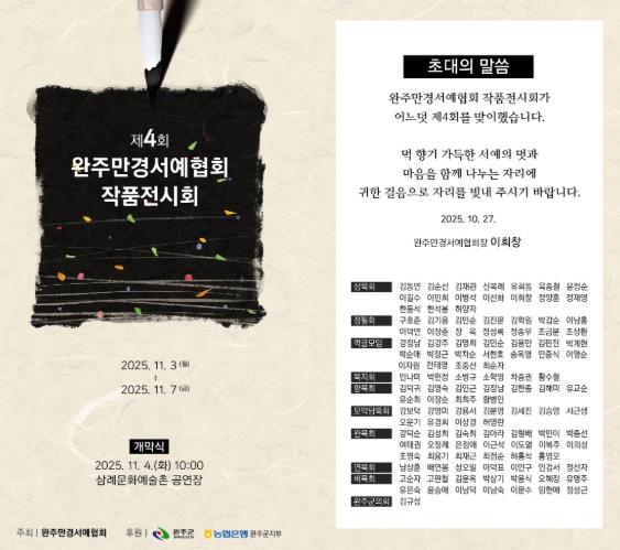 이희창 협회장은 “회원들의 땀과 열정으로 준비한 이번 전시회가 완주의 문화적 품격을 높이고, 군민 모두가 예술로 소통하는 계기가 되길 바란다”며 “앞으로도 전통서예의 아름다움을 널리 알리고 현대 감각과 조화를 이루는 예술 발전에 힘쓰겠다”고 말했다.
