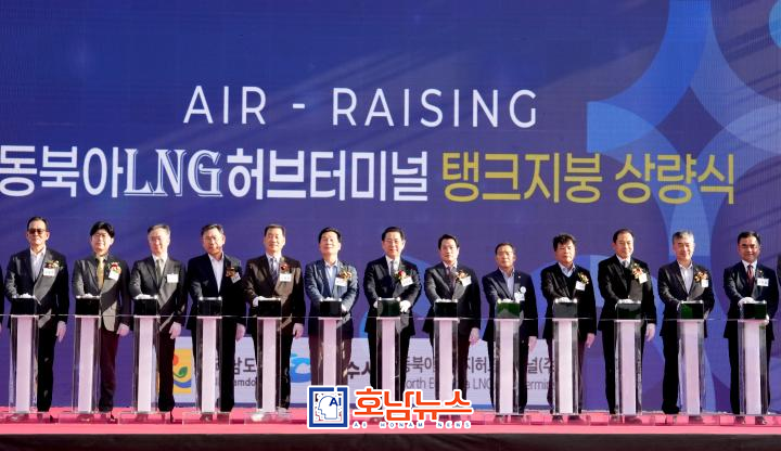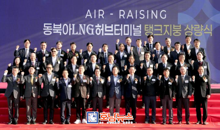The Jeollanam-do Provincial Government announced on the 5th that a roof-raising ceremony for the “Yeosu Myodo LNG Hub Terminal,” a ₩1.4 trillion (approximately USD 1 billion) project, was held in Myodo, Yeosu.