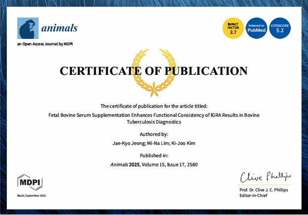 해당 논문의 제목은 “Fetal Bovine Serum Supplementation Enhances Functional Consistency of IGRA Results in Bovine Tuberculosis Diagnostics”로, 소 혈액에 우태아혈청(FBS, Fetal Bovine Serum)을 보충할 경우 기존 진단 방식 대비 위음성 발생을 줄이고 검사 결과의 민감도와 정확도를 향상시키는 효과가 있음을 확인한 내용이다.