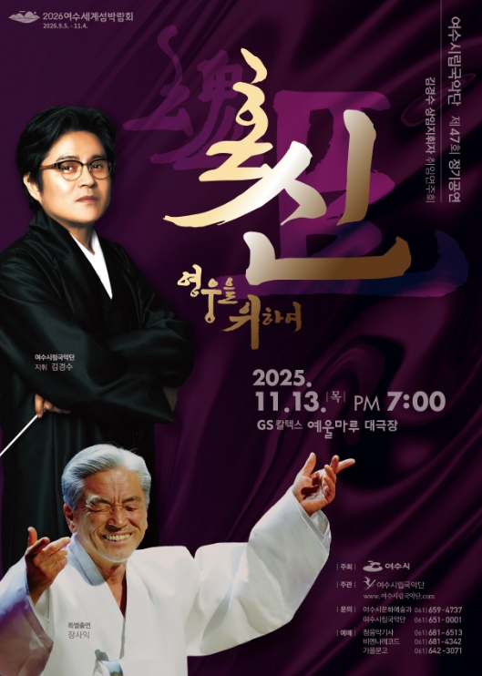 여수시립국악단은 이번 무대를 통해 ‘영웅’에 대한 새로운 시각을 음악으로 풀어내며 시민들에게 깊은 울림과 감동을 선사할 예정이다.