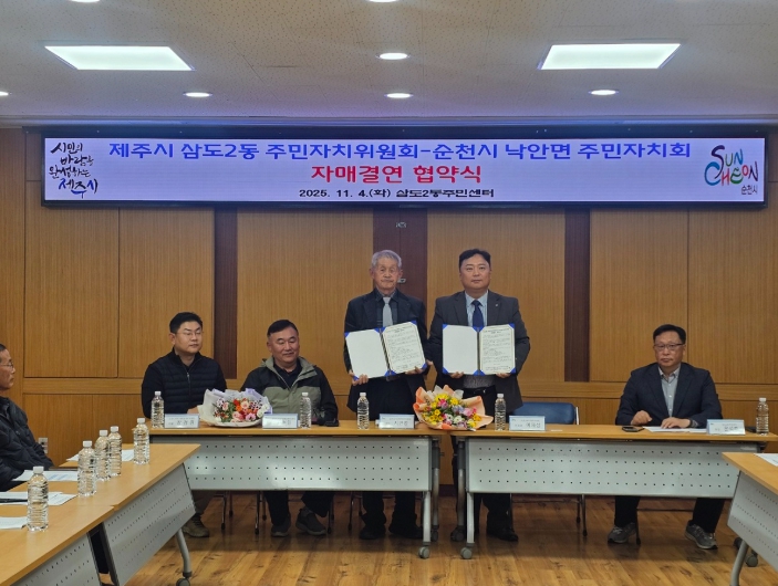 자매결연식은 제주시 삼도2동 주민센터에서 열렸으며, 두 지역의 주민자치위원과 관계 공무원 등이 참석했다.