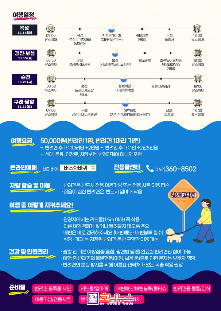 도는 관광지 순환버스 ‘남도한바퀴’의 11월 특별코스로 반려견 동반 당일 여행과 1박 2일 남도여행 상품을 새롭게 선보인다고 밝혔다.