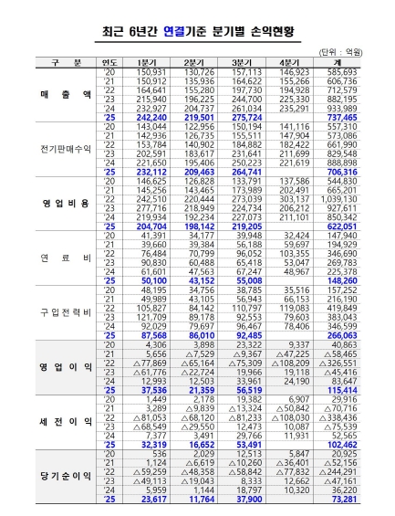 ![]() 최근 6년간 분기별 손익현황 (연결기준) |