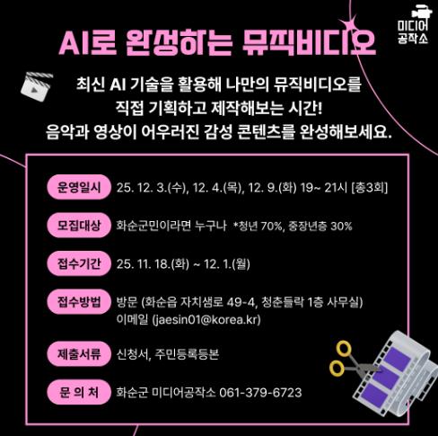 조미화 인구청년정책과장은 “최신 생성형 AI 도구를 활용해 누구나 쉽게 감성 뮤직비디오를 제작할 기회를 마련했으며, 앞으로도 다양한 온라인 콘텐츠 제작 프로그램을 통해 창작 경험을 넓혀갈 계획이다.”라고 말했다.