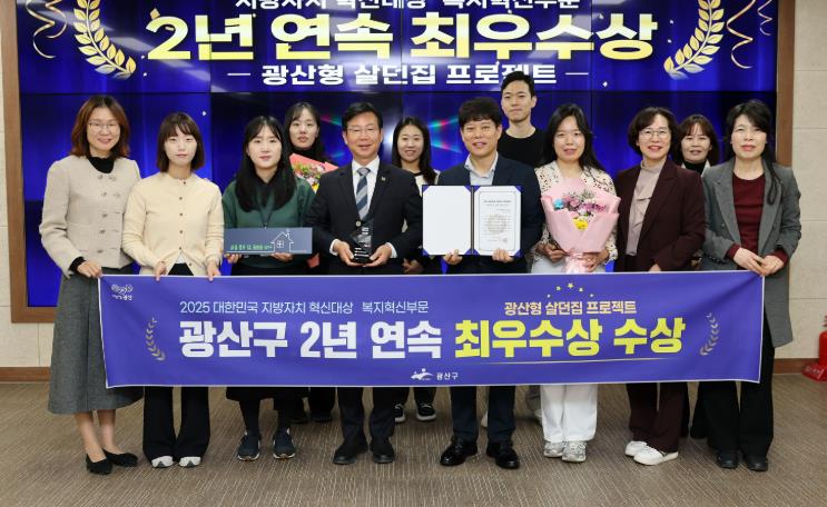 ![]() 광산구가 ‘2025 대한민국 지방자치 혁신대상’에서 2년 연속 최우수상을 받았다. 이 상으로 광산구 ‘살던집 프로젝트’는 복지 혁신 평가 2관왕을 기록하게 됐다. |