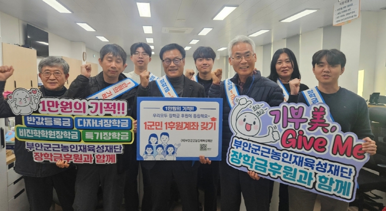 이번 캠페인 참여는 농업기술센터 직원들이 지역 농업·농촌의 지속 가능한 발전을 이끌 청년 세대를 응원하자는 취지에서 이루어졌으며, 직원들은 ‘장학금 1군민 1후원계좌 갖기’ 정기후원 홍보캠페인을 통해 지역 학생들의 학비 부담을 덜고, 더 나은 교육환경을 조성하는 일에 마음을 모았다.