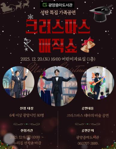![]() 광양중마도서관, 성탄 특집 ‘크리스마스 매직쇼’ 공연 개최 |