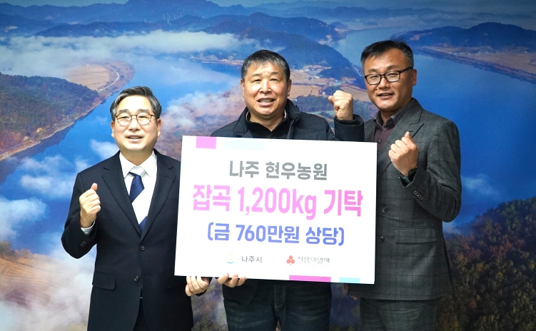 ![]() 현우농원 최진원 대표(가운데)는 16일 어려운 이웃에게 전해달라며 강상구 나주 부시장(왼쪽)에게 백미와 찰기장·찰수수 등 1200kg을 기탁했다. (사진 제공-나주시) |