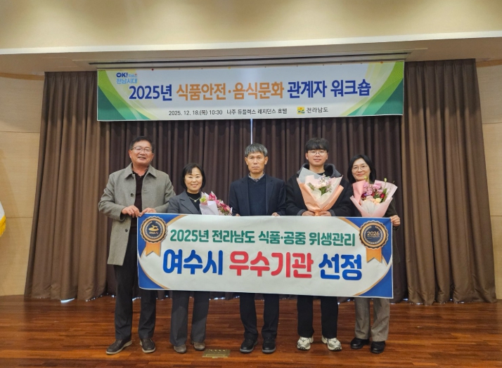 ![]() 여수시가 전라남도 주관 ‘2025년 식품·공중 위생업무 평가’에서 우수기관으로 선정됐다. |