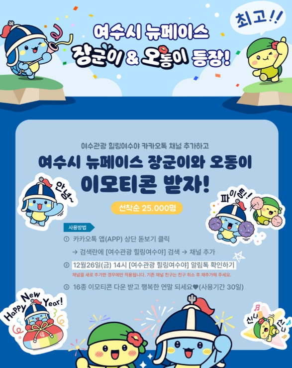 ![]() 여수시 마스코트 ‘장군이·오동이’ 카카오톡 이모티콘 무료 배포 홍보물 |