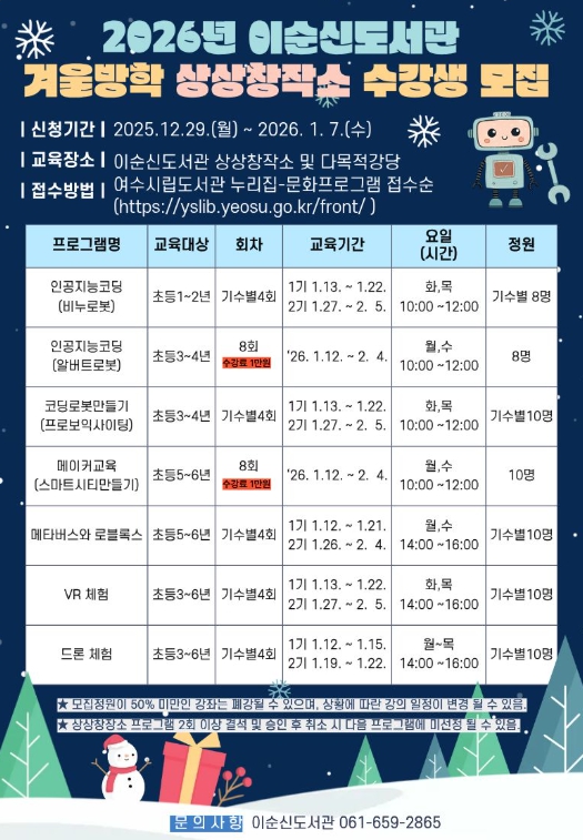 ![]() ‘이순신도서관 겨울방학 상상창작소 수강생 모집’ 홍보물 |