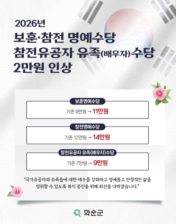 ![]() 화순군, 2026년 보훈 관련 수당 인상(카드 뉴스) |