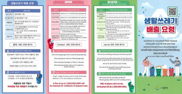 나주시는 언어장벽으로 생활폐기물 배출에 어려움을 겪는 외국인을 대상으로 적정 배출 방법을 안내하기 위해 접이식 리플릿 형태의 다국어 홍보물을 제작했다고 2일 밝혔다.