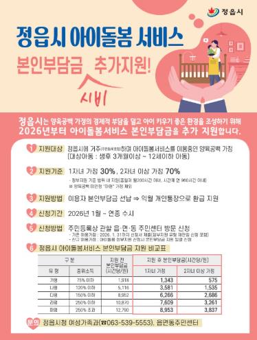 ![]() “아이 키우기 좋은 정읍”…올해부터 아이돌봄 본인부담금 최대 70% 지원(포스터). |