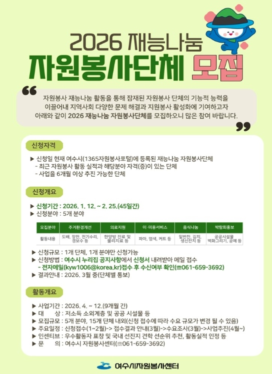 ![]() 여수시는 오늘(12일)부터 오는 2월 25일까지 ‘2026 찾아가는 재능나눔 프로그램’에 참여할 자원봉사 단체를 모집한다. |
