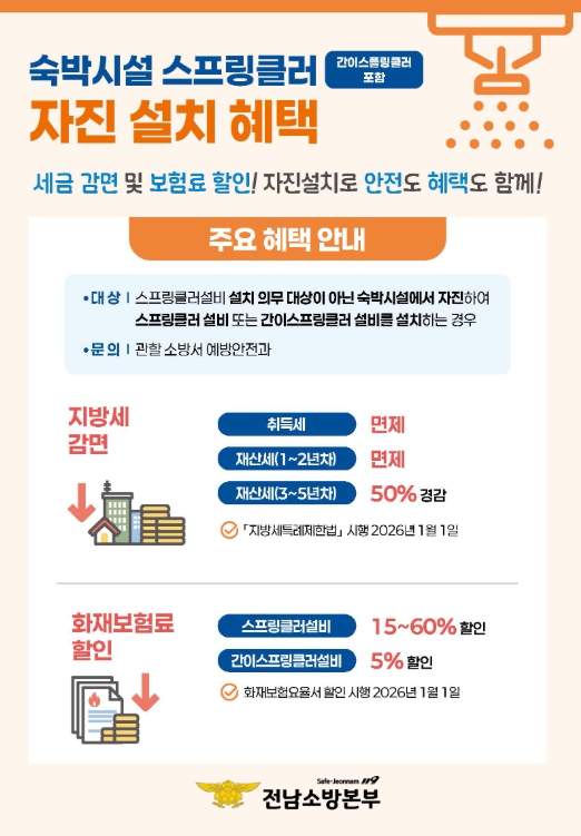 ![]() 자발적 소방시설 설치 숙박시설에 지방세 감면 및 보험료 할인 |