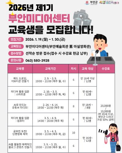 ![]() 부안미디어센터, 2026년 제1기 미디어교육 교육생 모집 |