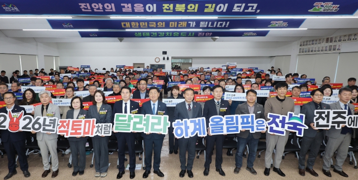 ![]() '도민과 함께하는 2026년 시군 방문'에 나선 김관영 전북특별자치도지사는 14일 진안군을 방문해 도민과의 대화 시간을 갖고 전춘성 진안군수를 비롯한 참석자들과 하계올림픽 전북 전주 유치기원 퍼포먼스를 갖고 있다. |