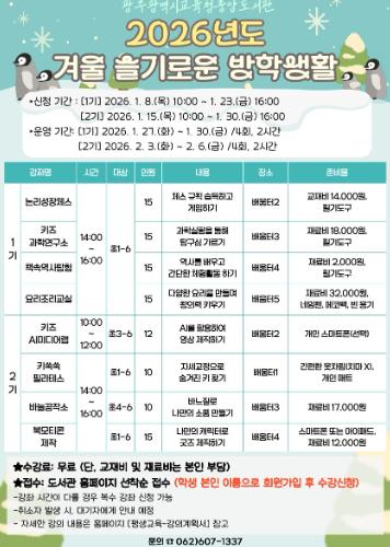 ![]() 광주광역시교육청 중앙도서관, ‘겨울 슬기로운 방학생활’ 운영 |