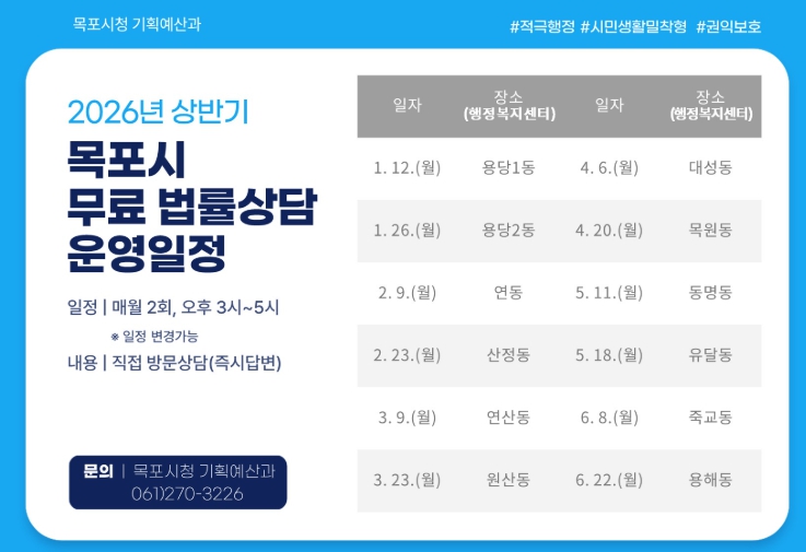 한편, 상담 일정은 사정에 따라 변경될 수 있으며, 무료 법률상담과 관련한 자세한 사항은 목포시청 기획예산과로 문의하면 된다.
