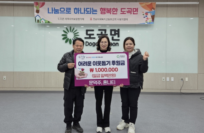 김수진 도곡면장은 “해마다 잊지 않고 따뜻한 마음을 전해주시는 데 깊은 감사를 드린다”라며, “부부의 따뜻한 마음이 지역사회의 이웃들에게 선한 영향력으로 전하고 있다”라고 말했다.