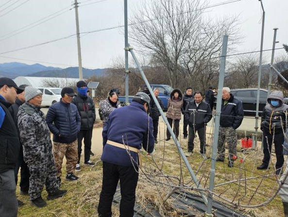 ![]() 지난 23일 곡성군 겸면에 소재한 농가에서 사과 다축 동계전정 현장 교육이 진행되고 있다. |