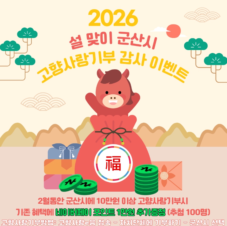 ![]() 군산시, 설맞이 고향사랑기부제 감사 이벤트 |