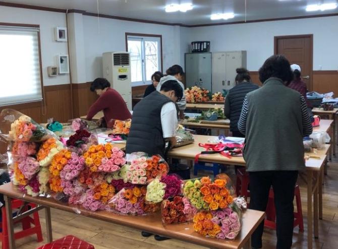 ![]() 농가들이 장미꽃다발을 만들고 있는 모습. |