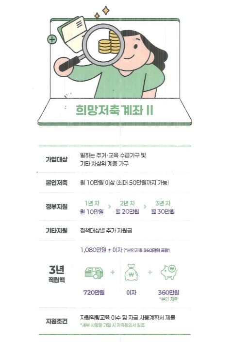 ‘희망저축계좌2’는 근로·사업 소득이 있는 주거·교육 급여 수급 가구 또는 차상위계층이 저축하는 경우, 정부가 일정 금액의 근로소득 장려금을 지원해주는 사업이다.