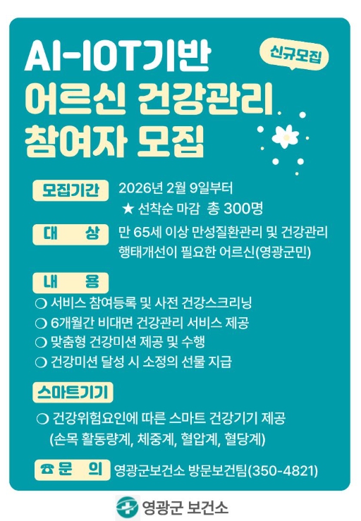 영광군은 2022년 AI・IOT 어르신 건강관리 시범사업부터 참여해왔으며, 건강행태 개선이 필요한 어르신들의 건강습관 형성과 자가 건강관리 능력 향상에 기여한 공로를 인정받아 지난 2년 연속 우수기관으로 선정된 바 있다.