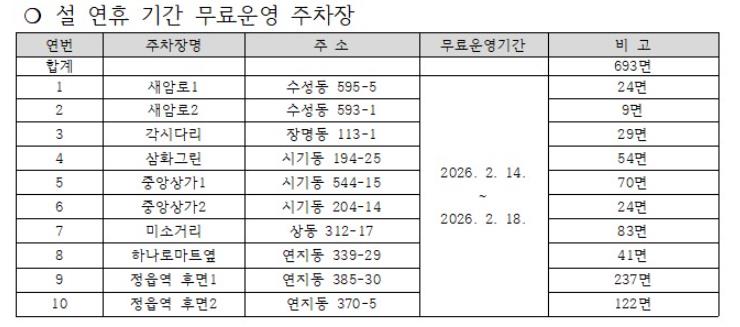 이번 조치는 명절을 맞아 고향을 찾는 귀성객과 시민들에게 주차 편의를 제공하고 시민들이 부담 없이 도심 상권과 전통시장을 이용할 수 있도록 유도해 지역 경제에 활력을 불어넣기 위해 마련됐다.