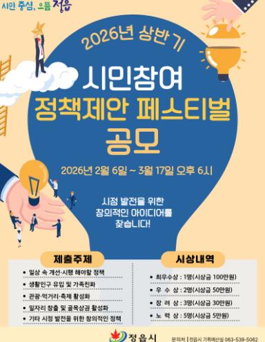 ![]() “정읍 발전 위한 아이디어 찾습니다”… 시민 제안 공모전 개최 |