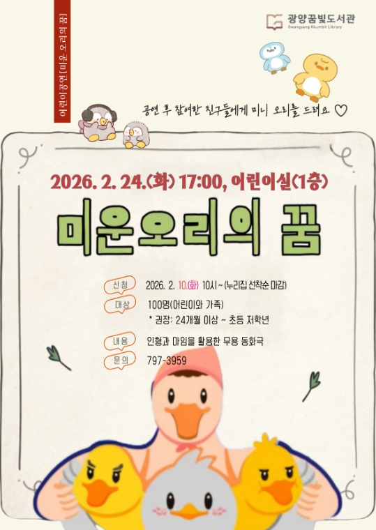 공연 관람은 어린이와 가족 100명을 선착순으로 모집하며, 신청은 2월 10일 오전 10시부터 광양시립도서관 누리집을 통해 가능하다.